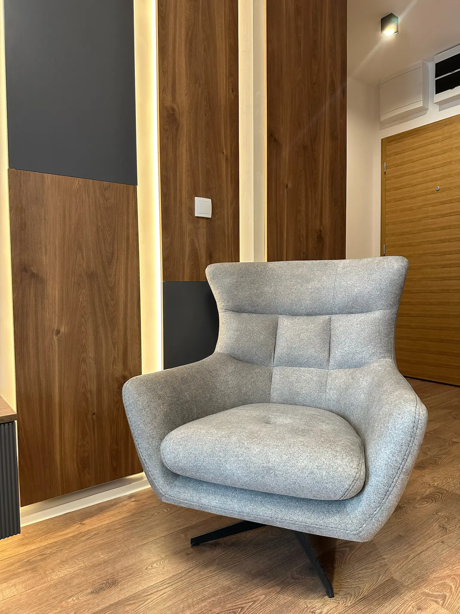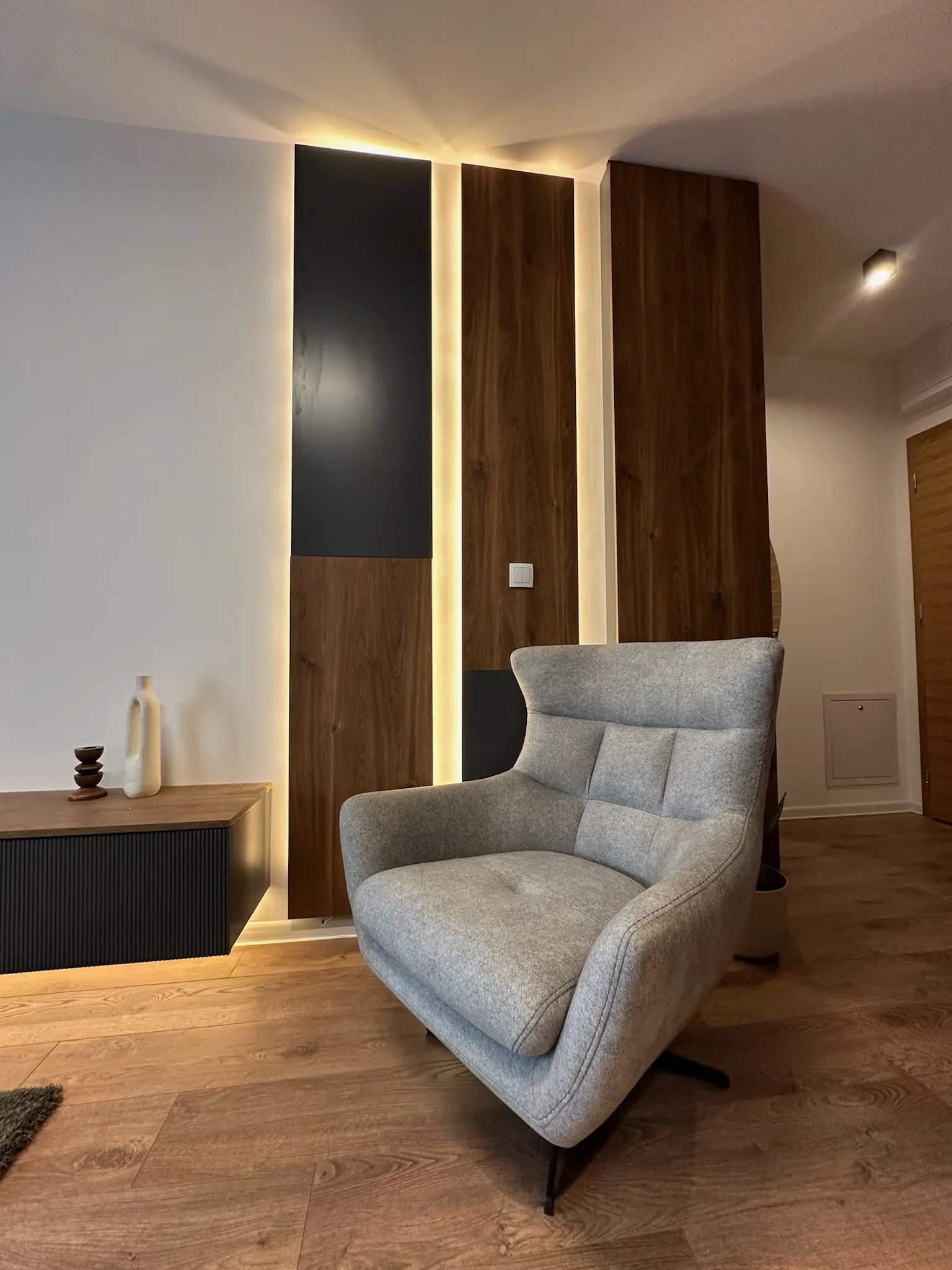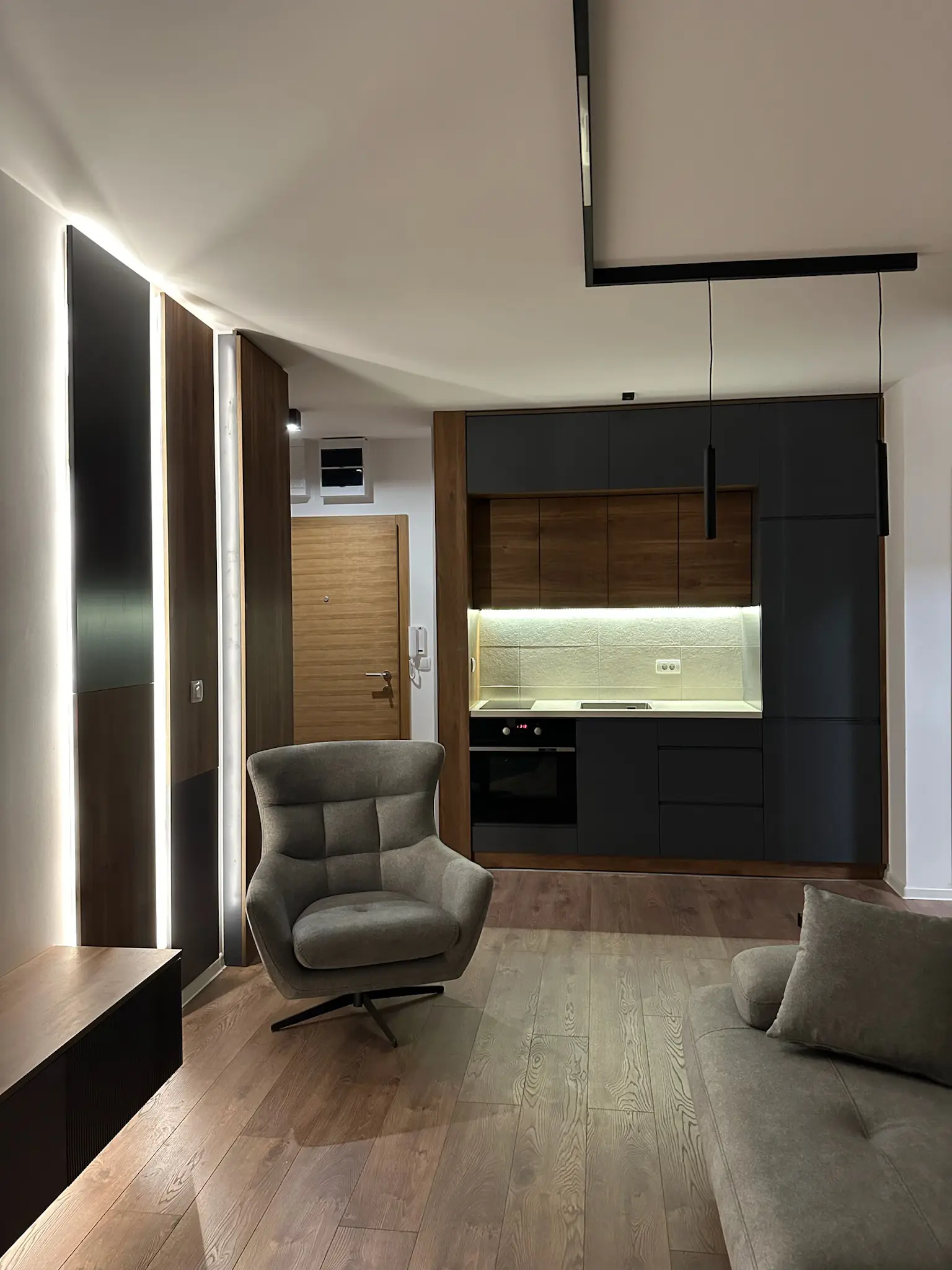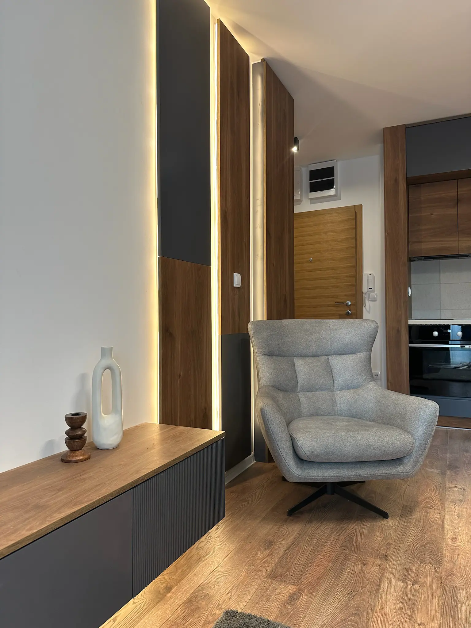 Projekat Amber u Jagodini objedinjuje predsoblje, kuhinju, dnevnu sobu, trpezariju, spavaću sobu i kupatilo u elegantan i funkcionalan enterijer. Dominiraju sivi tonovi, prirodno drvo i crni akcenti, sa pažljivo biranim detaljima kao što su LED osvetljenje, umetničke slike i zavese.