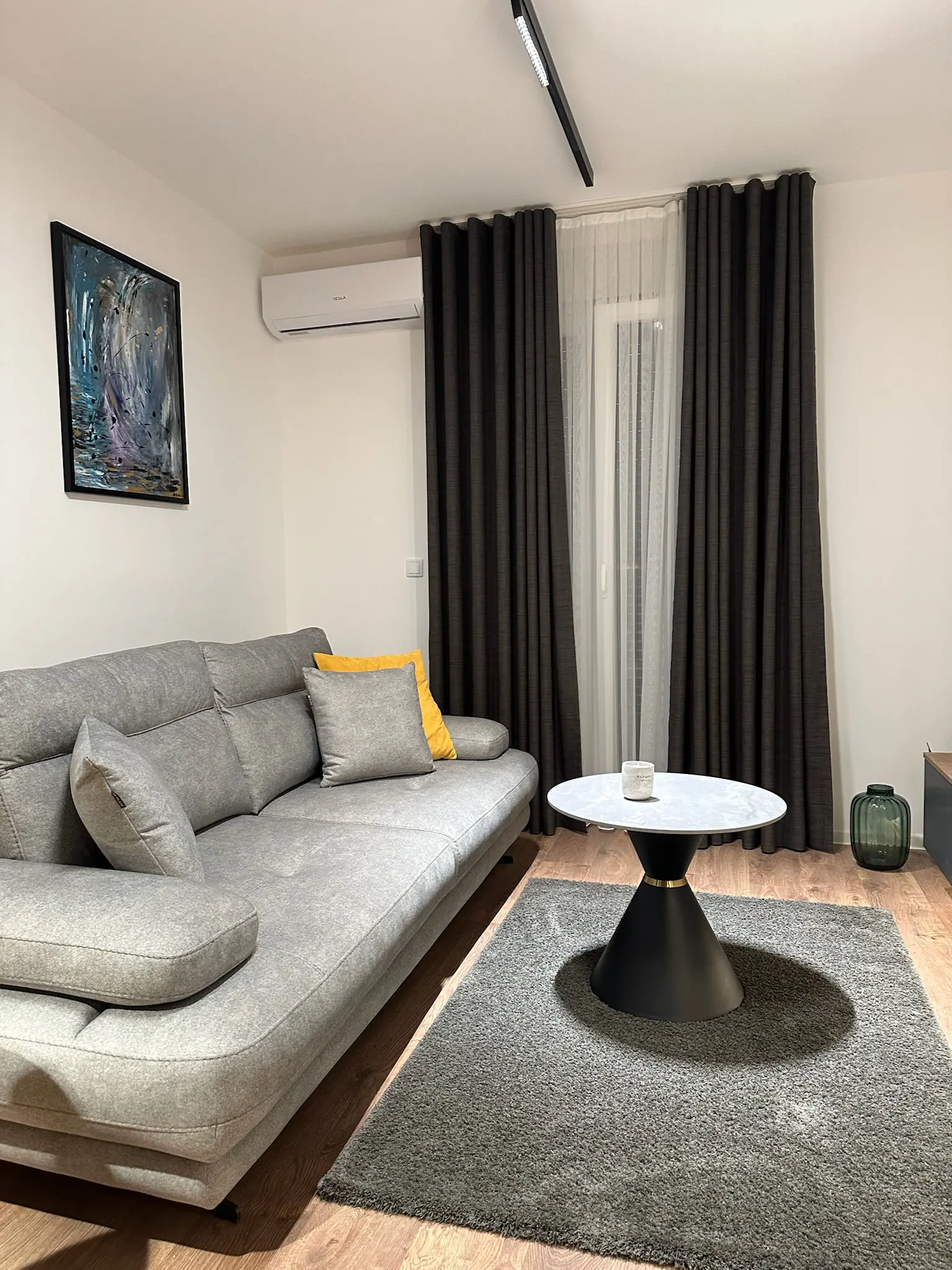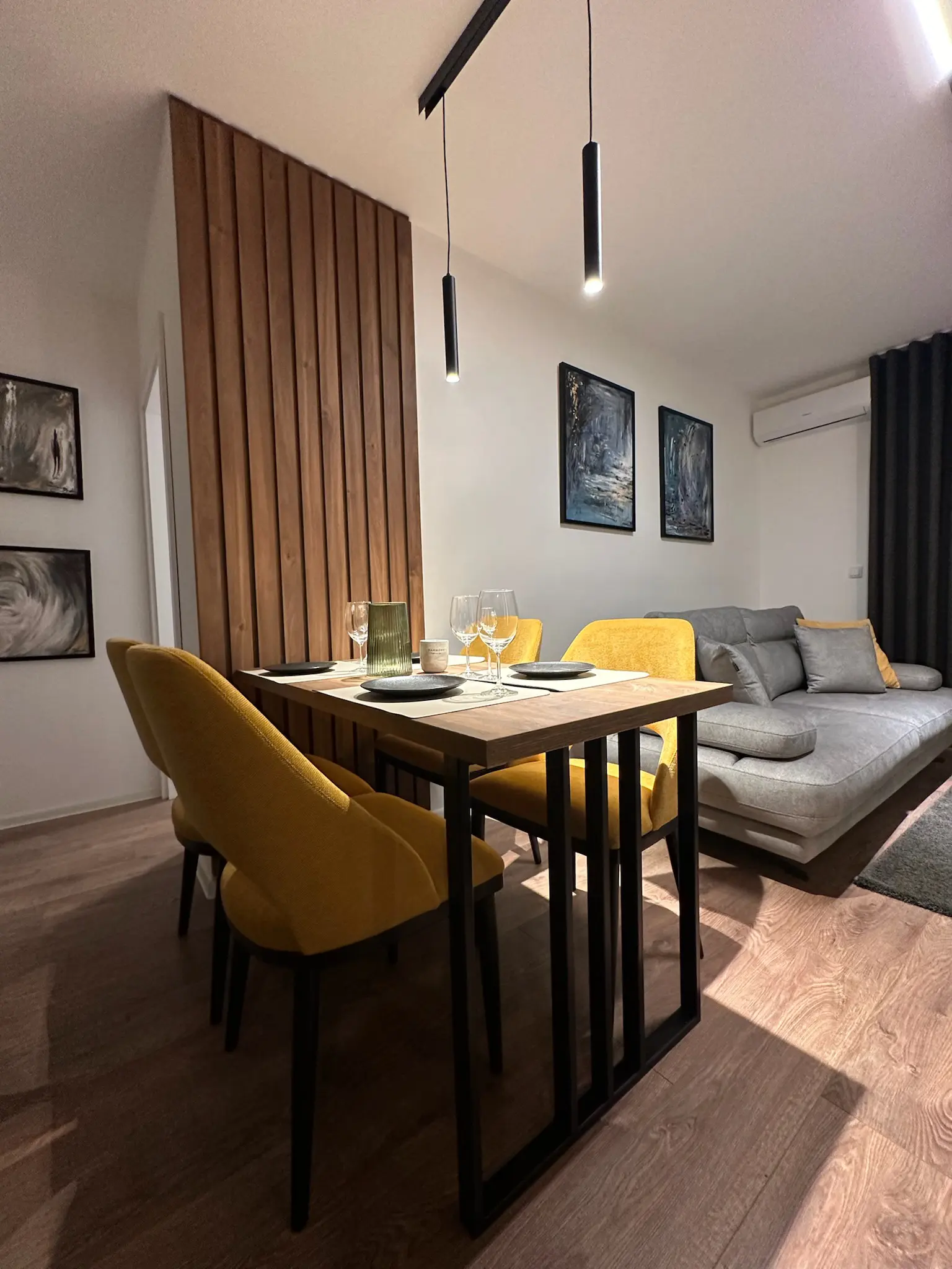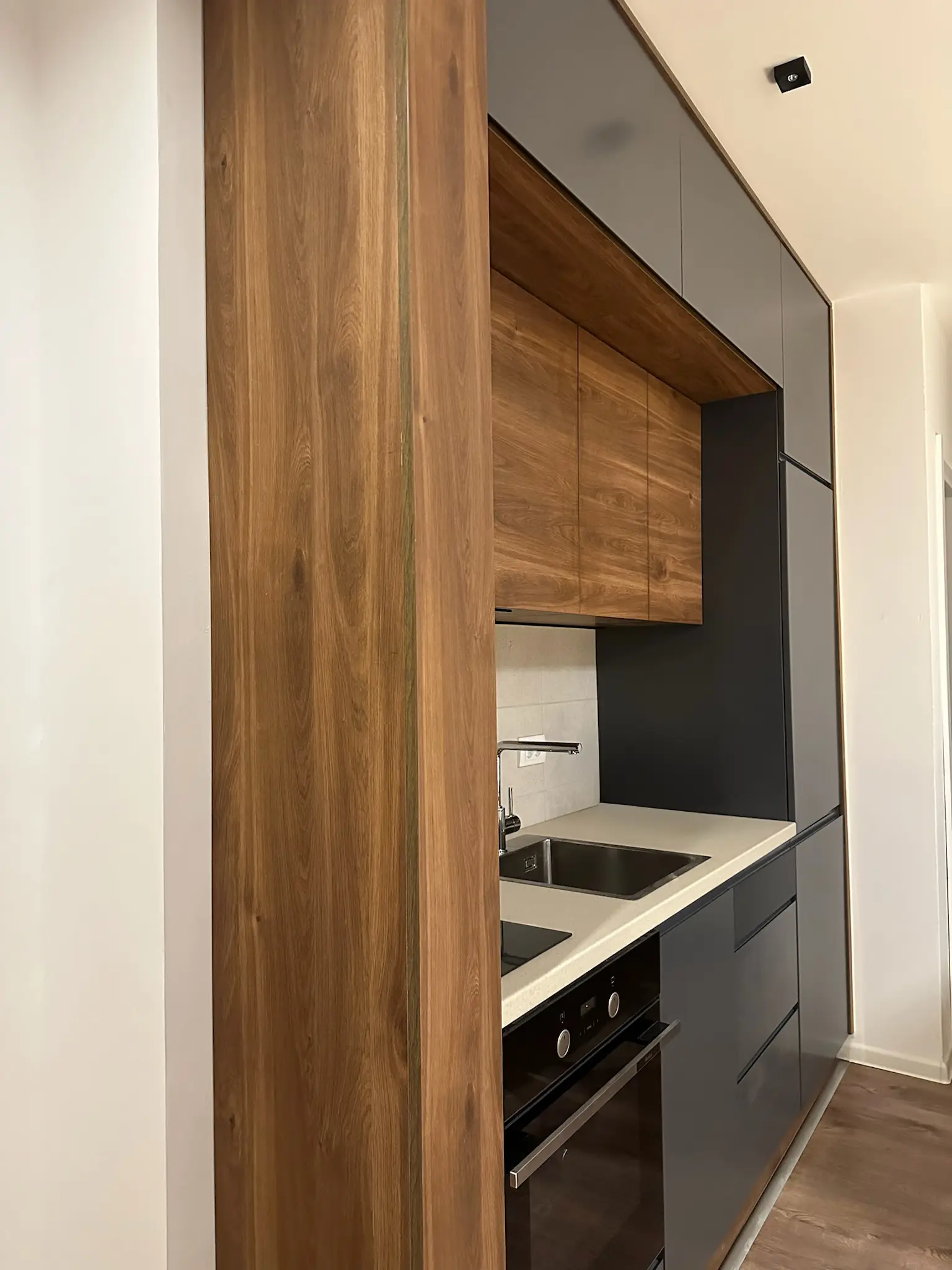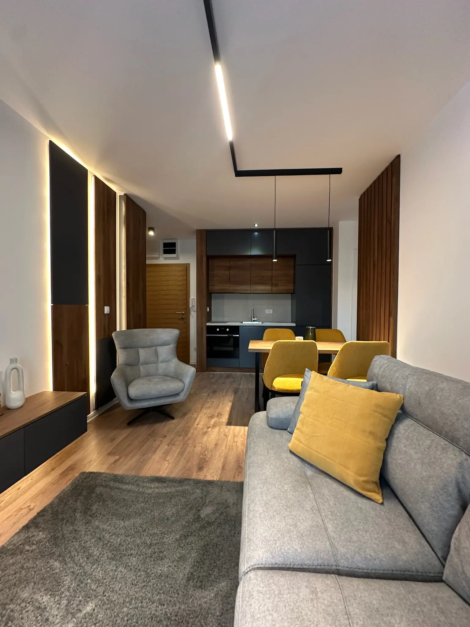 Projekat Amber u Jagodini objedinjuje predsoblje, kuhinju, dnevnu sobu, trpezariju, spavaću sobu i kupatilo u elegantan i funkcionalan enterijer. Dominiraju sivi tonovi, prirodno drvo i crni akcenti, sa pažljivo biranim detaljima kao što su LED osvetljenje, umetničke slike i zavese.