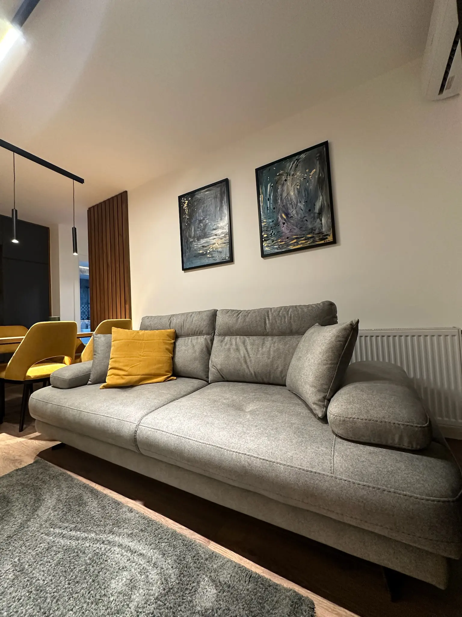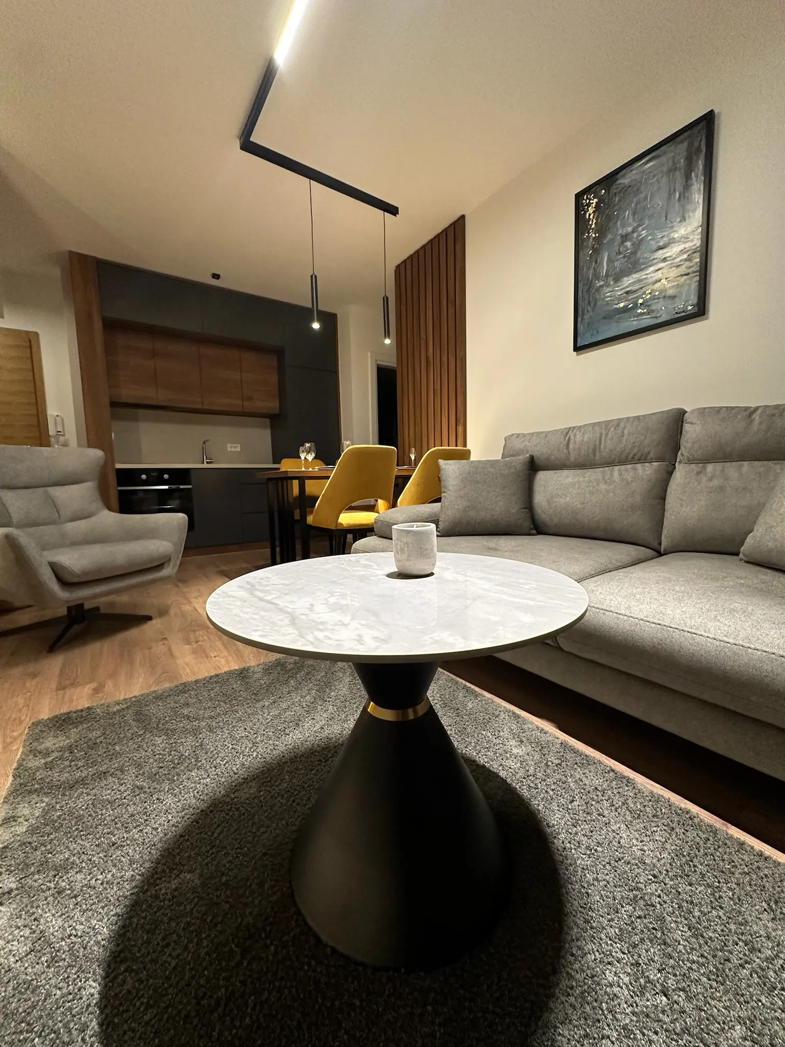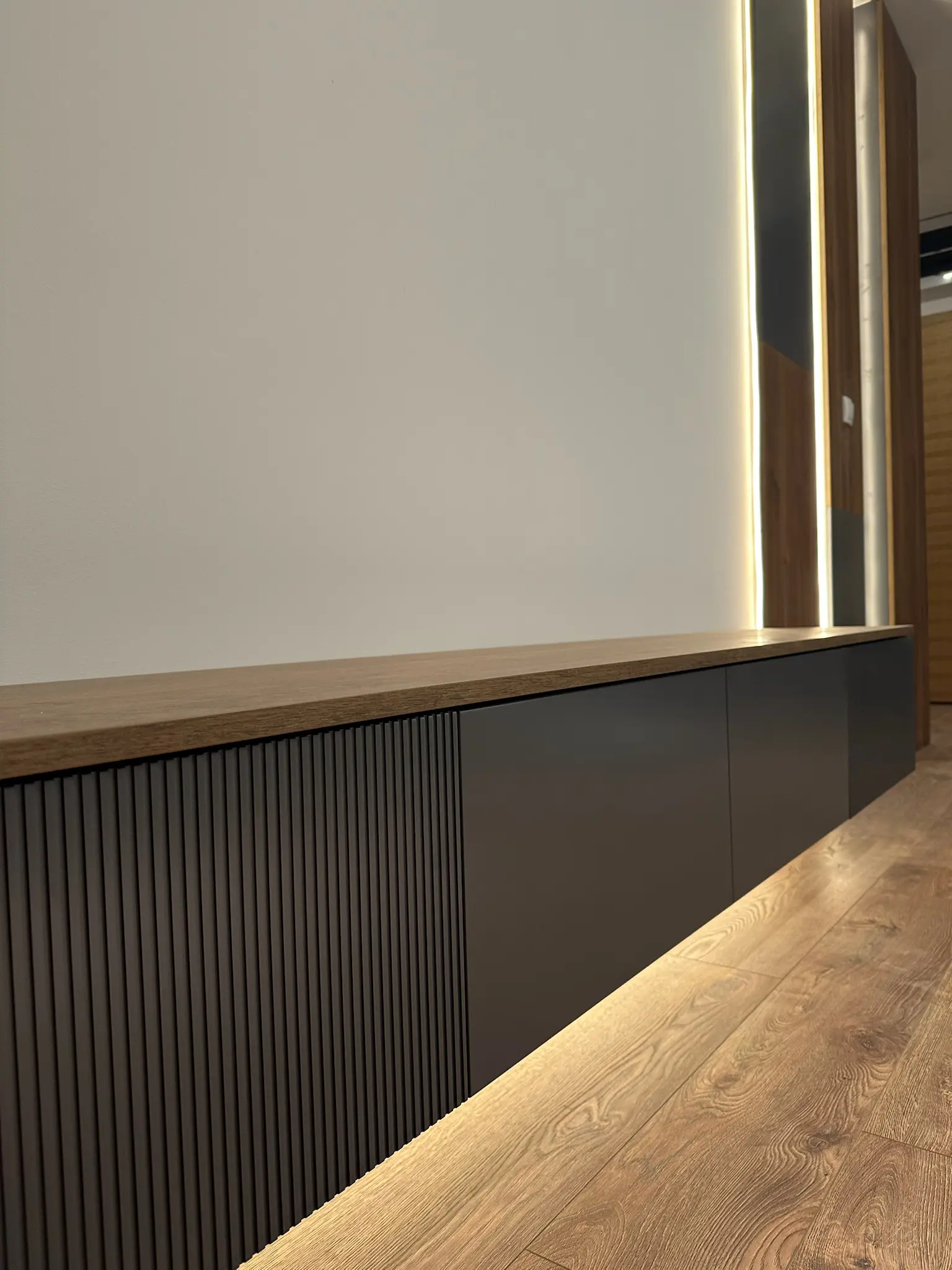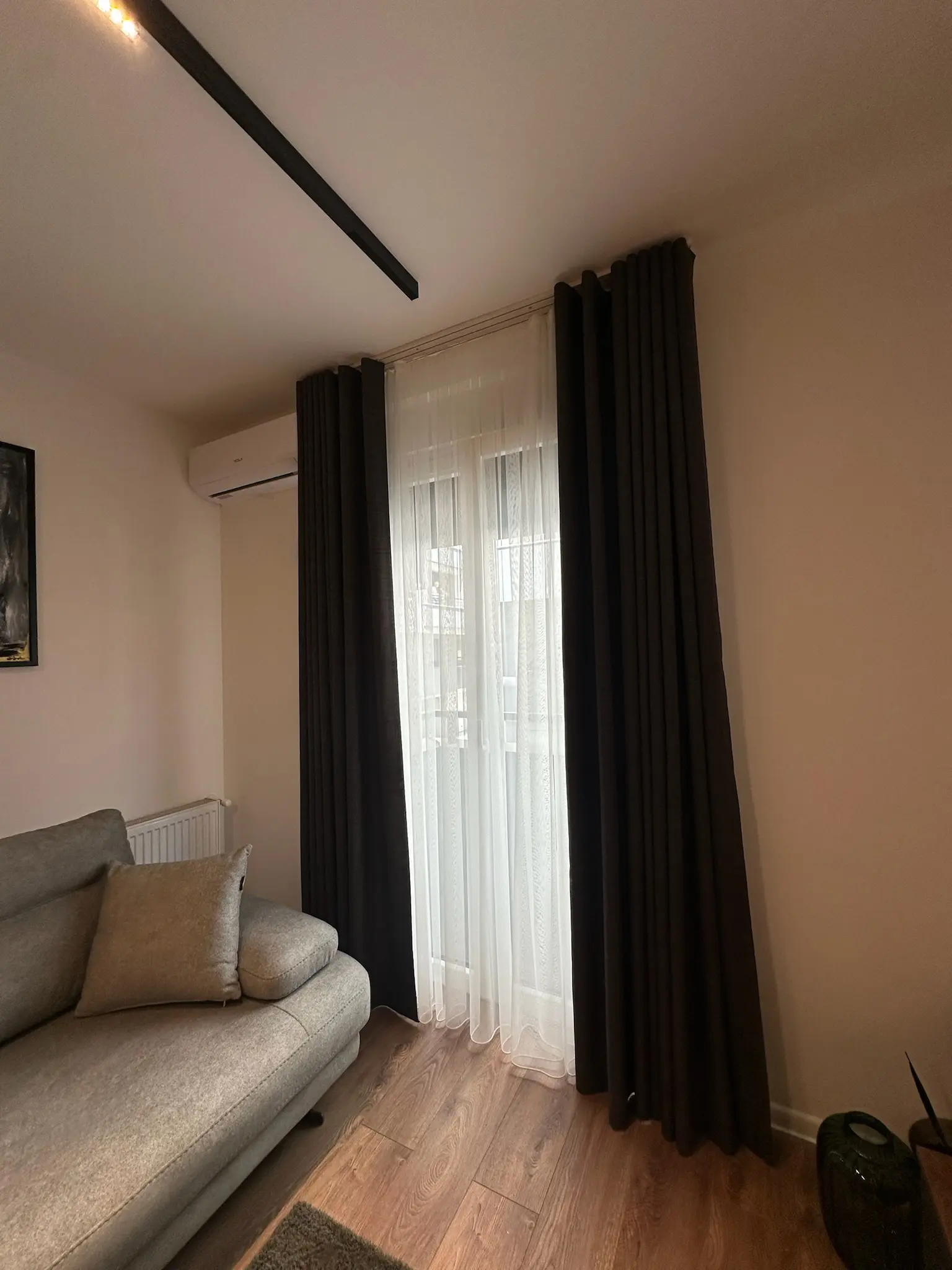 Projekat Amber u Jagodini objedinjuje predsoblje, kuhinju, dnevnu sobu, trpezariju, spavaću sobu i kupatilo u elegantan i funkcionalan enterijer. Dominiraju sivi tonovi, prirodno drvo i crni akcenti, sa pažljivo biranim detaljima kao što su LED osvetljenje, umetničke slike i zavese.
