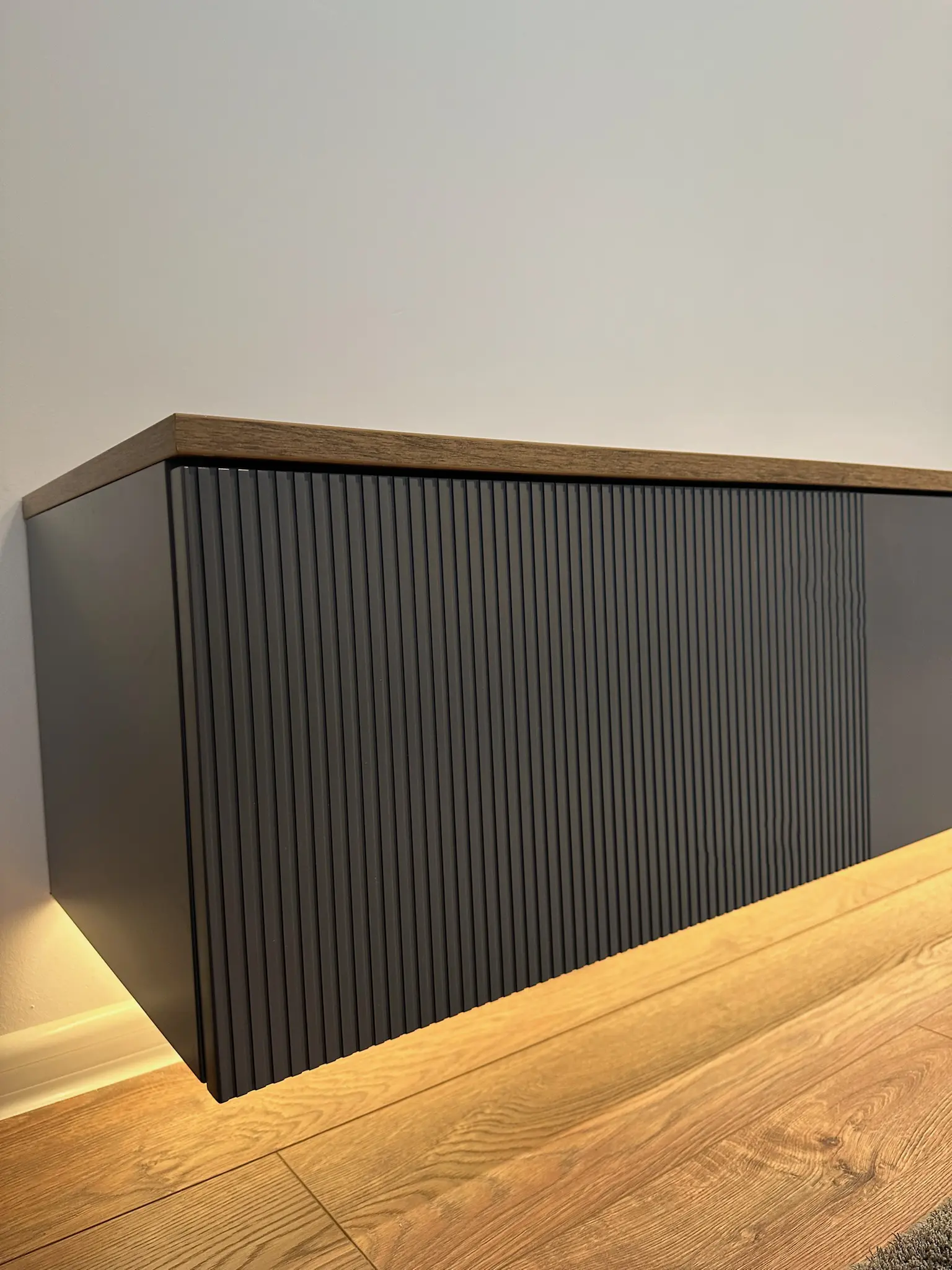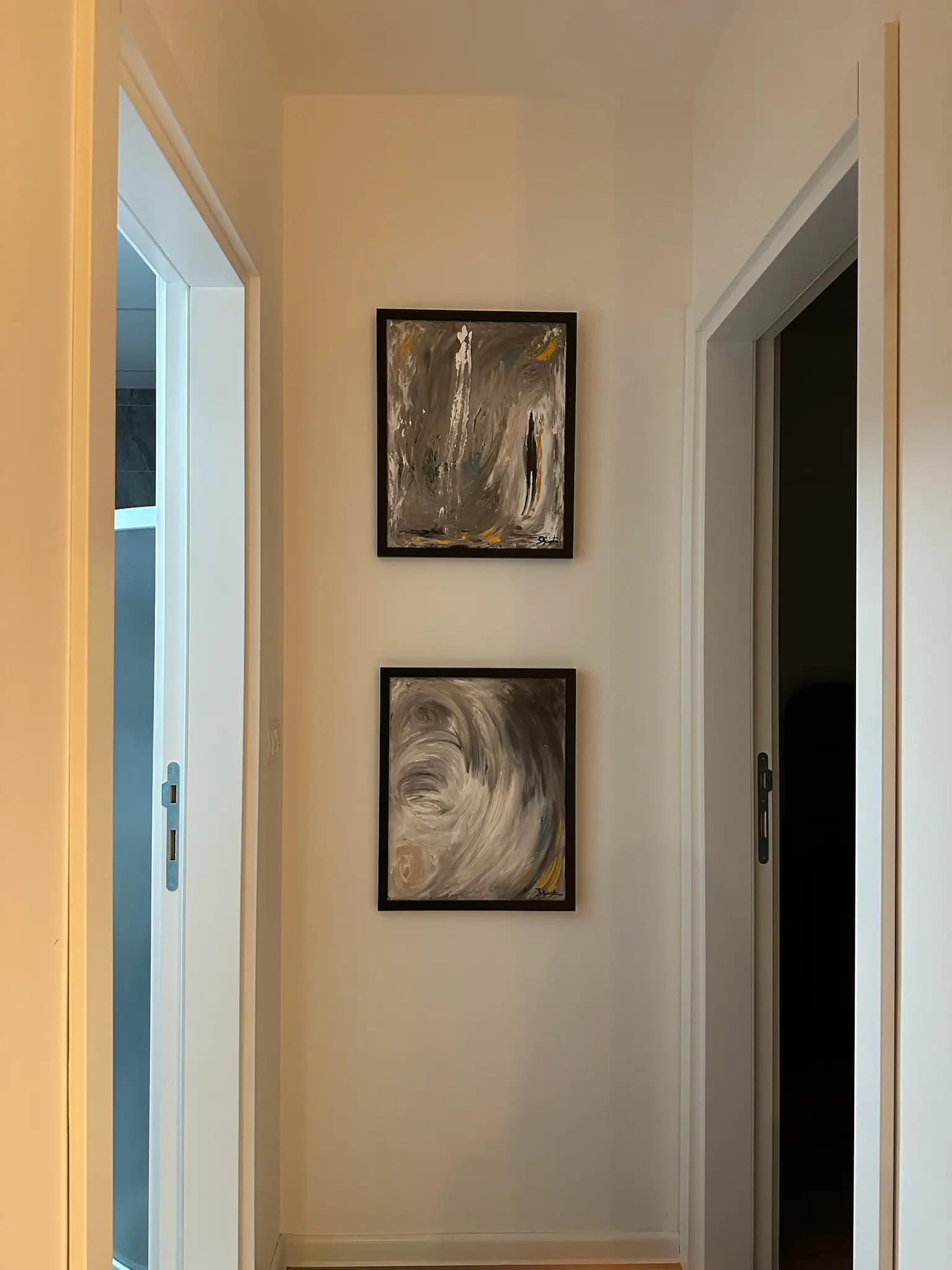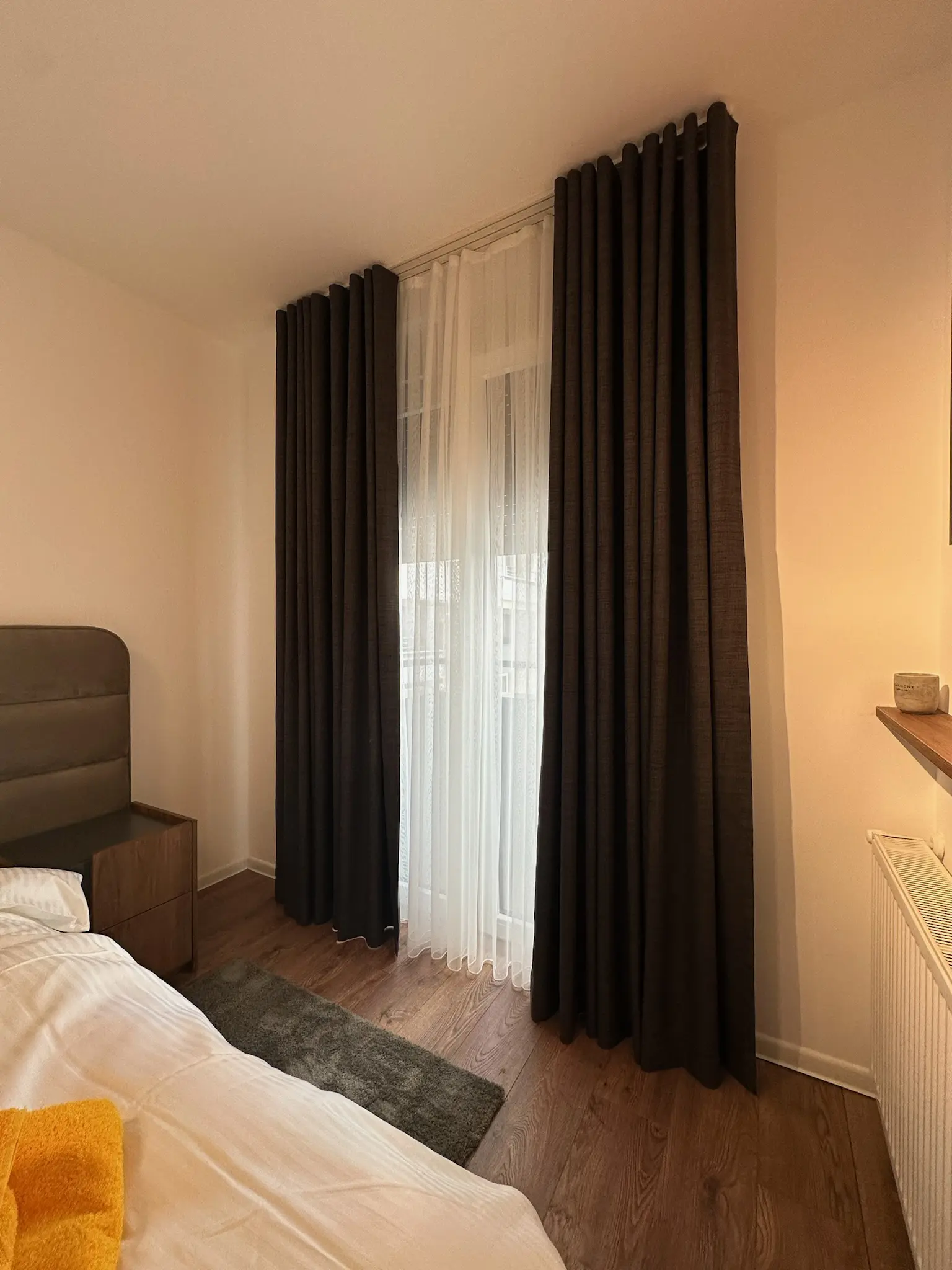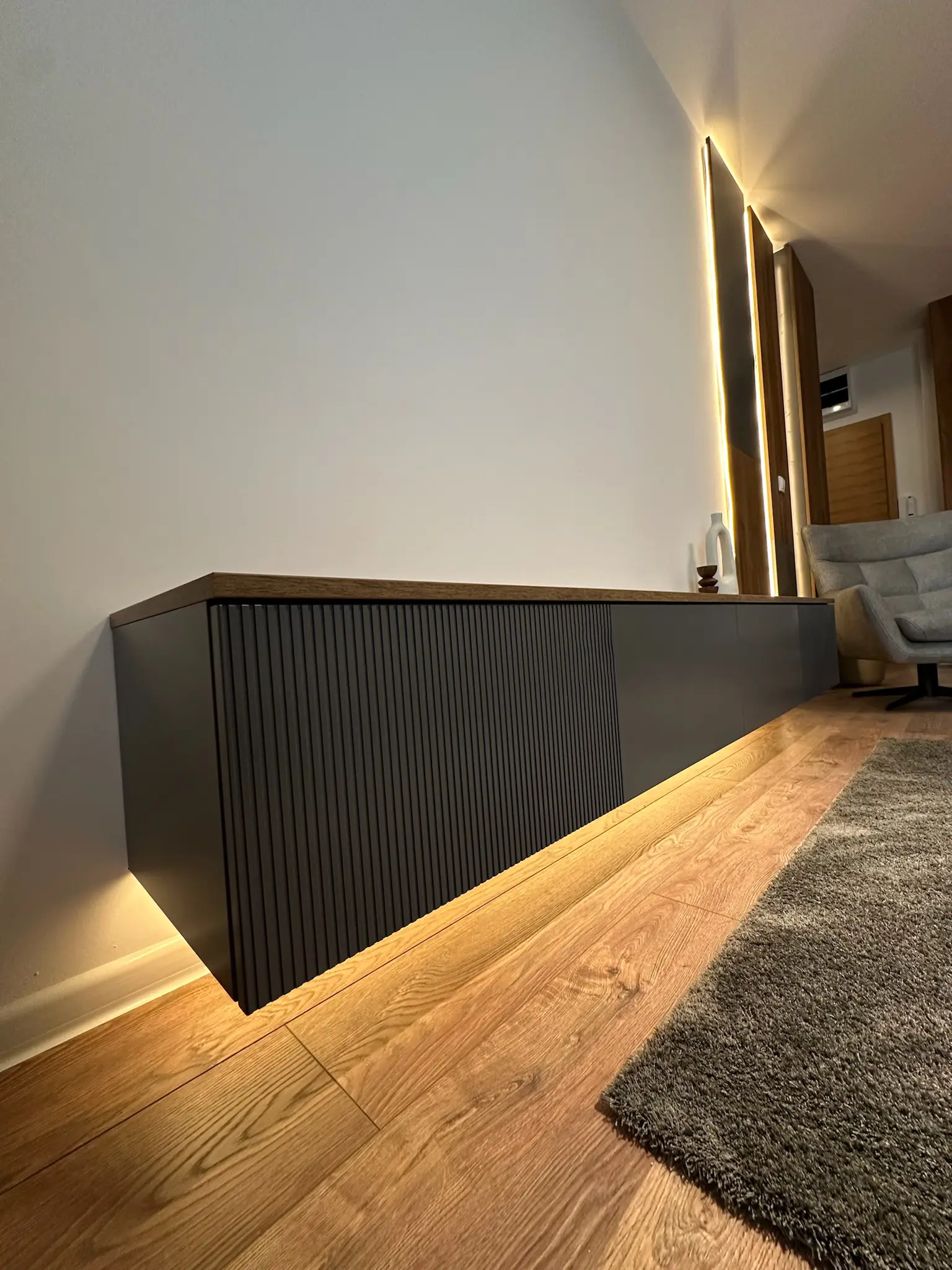 Projekat Amber u Jagodini objedinjuje predsoblje, kuhinju, dnevnu sobu, trpezariju, spavaću sobu i kupatilo u elegantan i funkcionalan enterijer. Dominiraju sivi tonovi, prirodno drvo i crni akcenti, sa pažljivo biranim detaljima kao što su LED osvetljenje, umetničke slike i zavese.