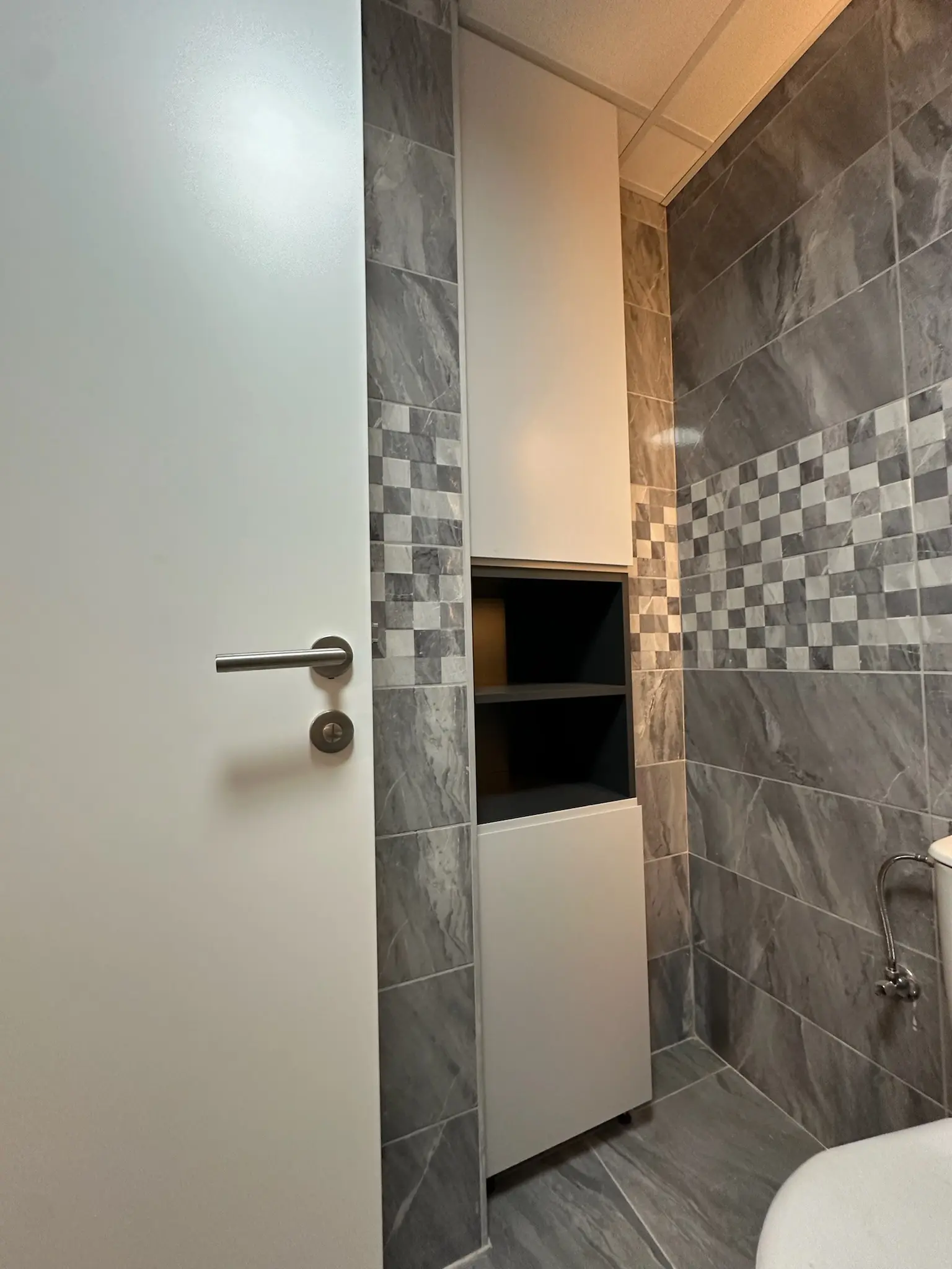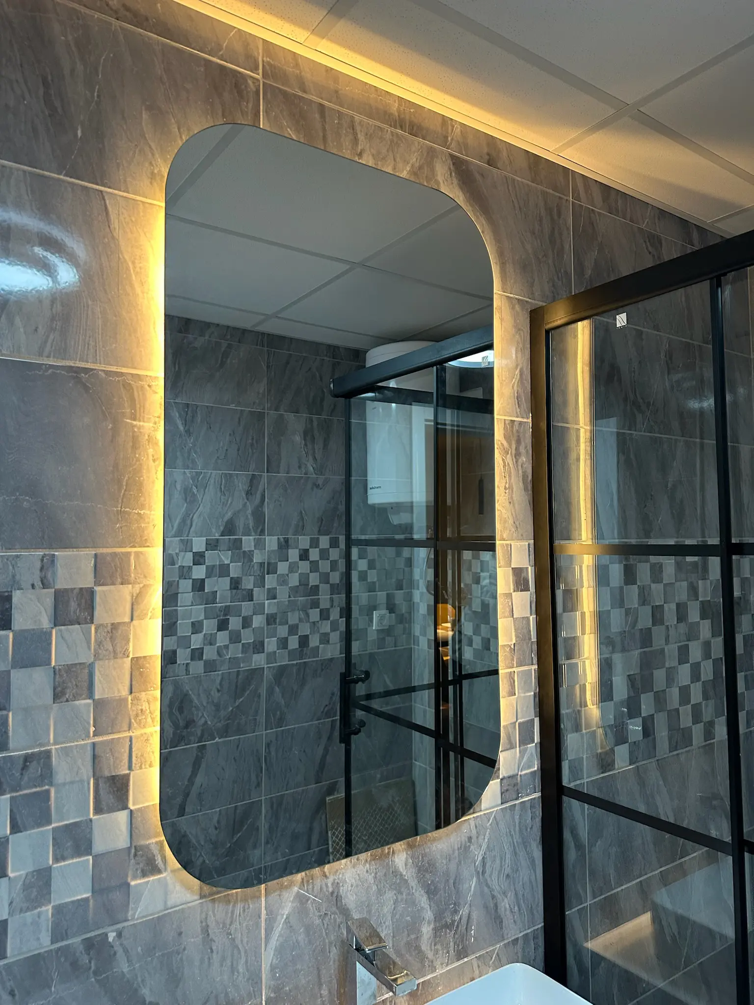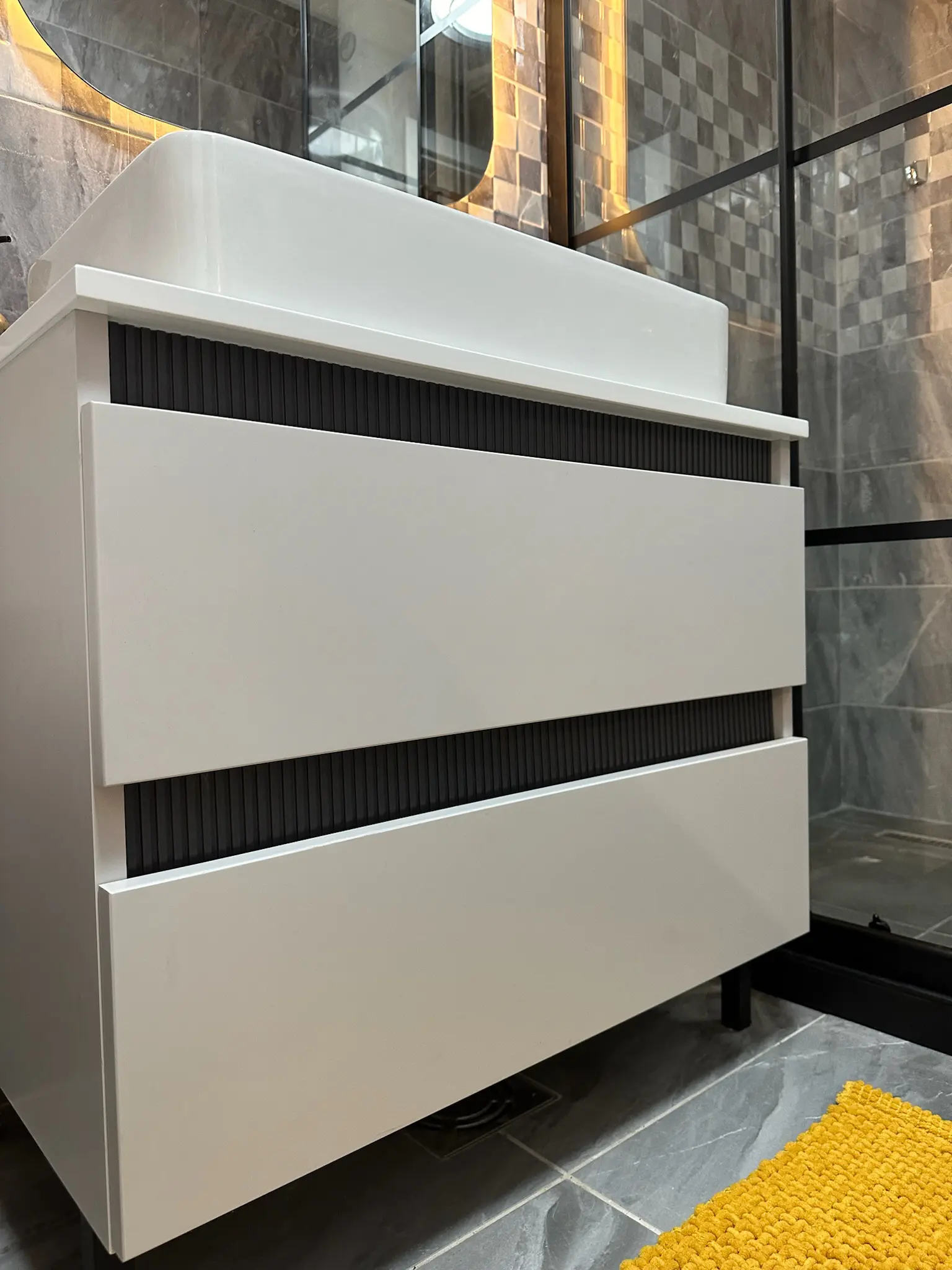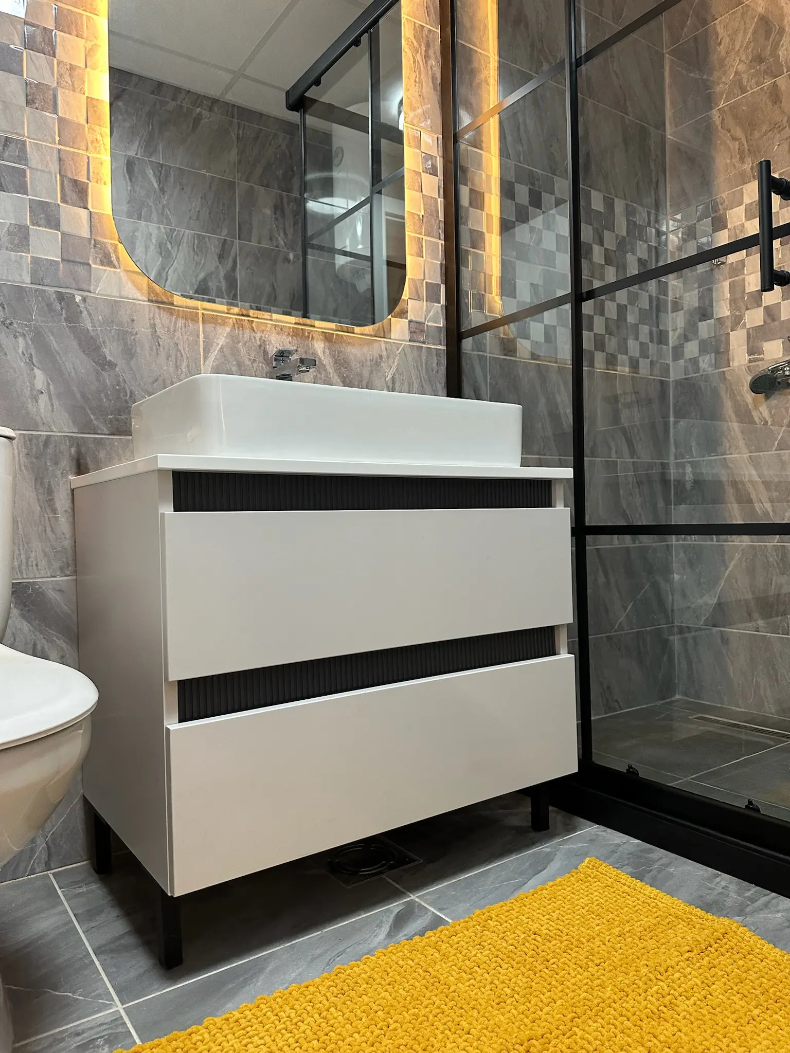 Kupatilo: beli nameštaj sa crnim detaljima i ogledalo sa osvetljenjem