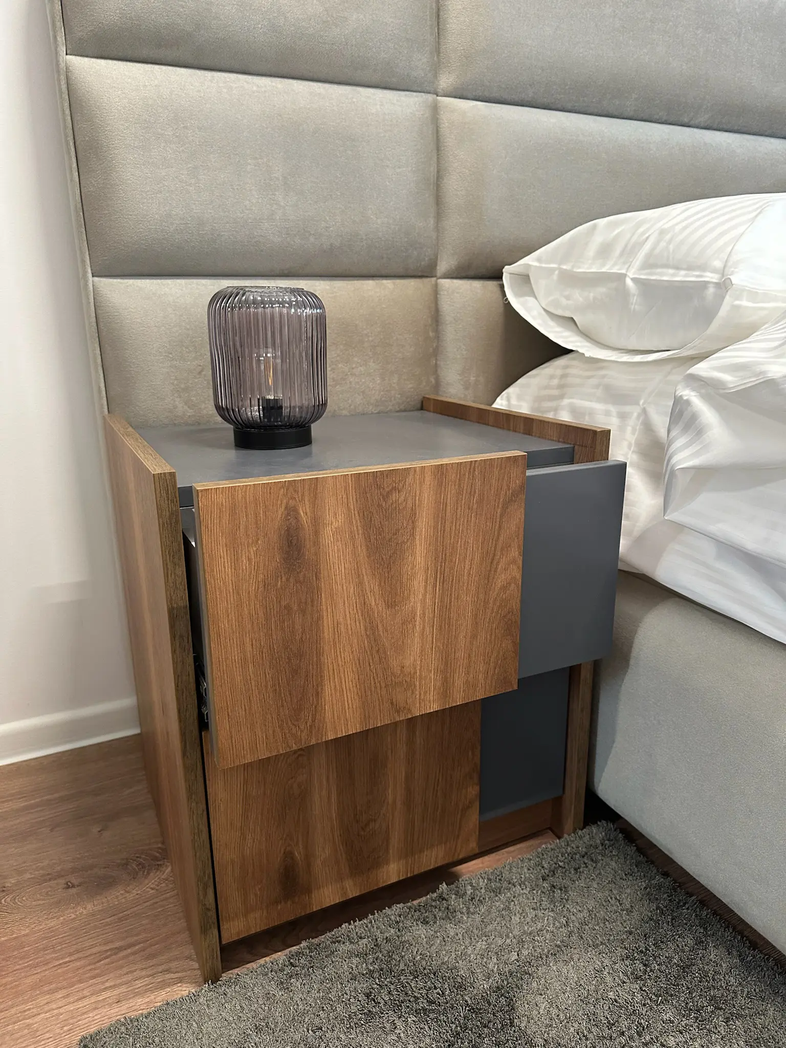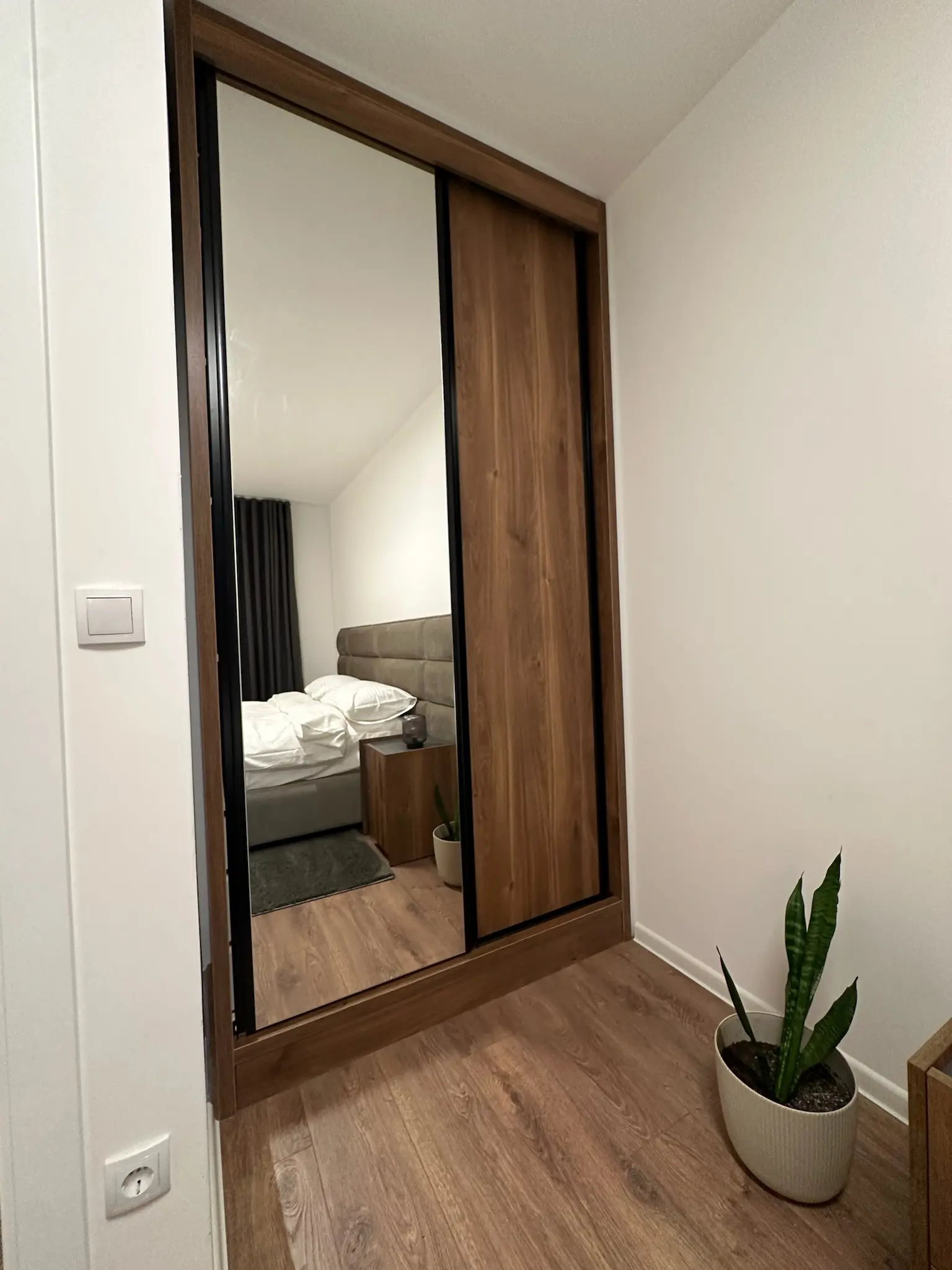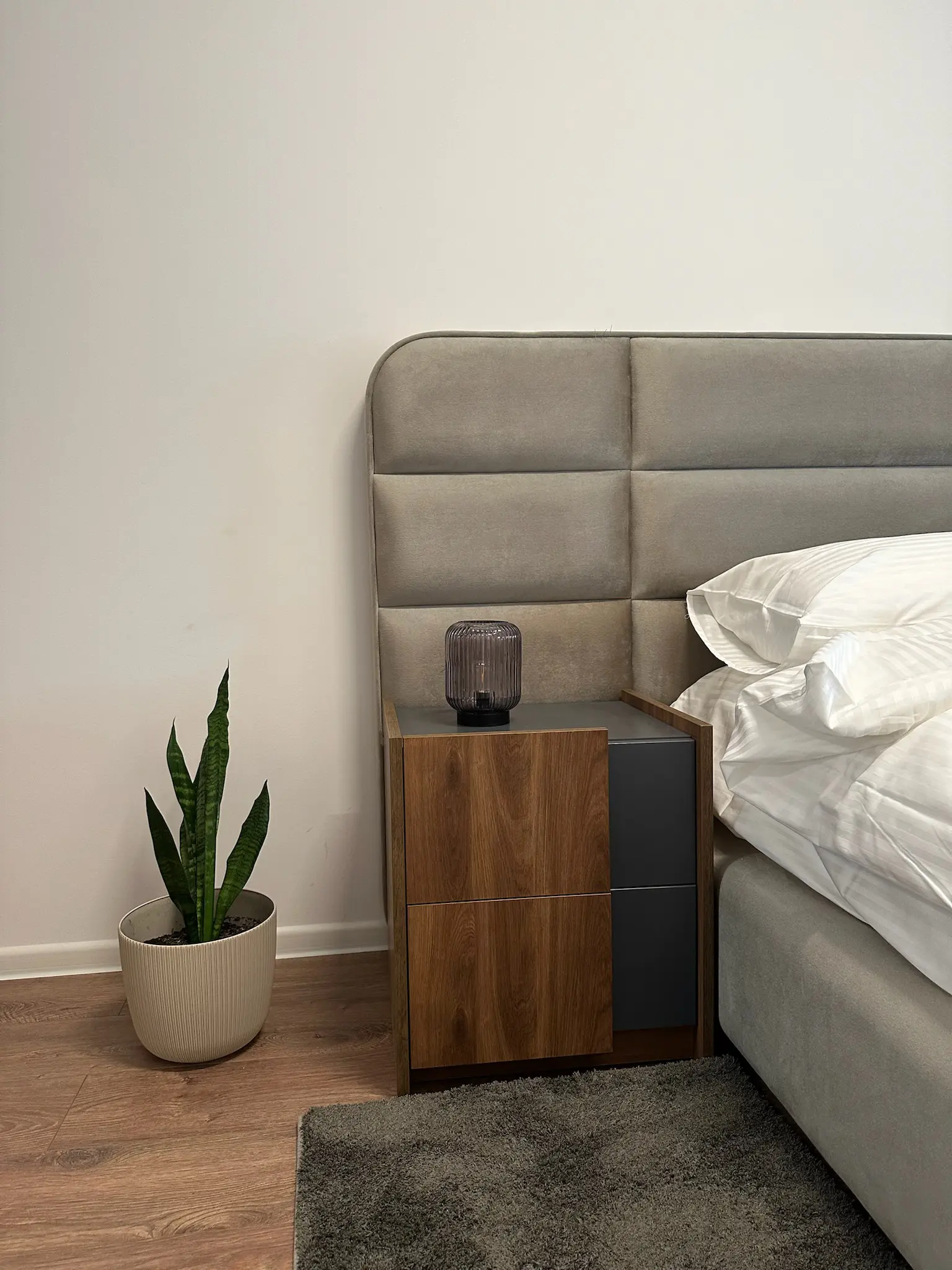 Spavaća soba: tapacirani krevet, bočni ormarići i garderober sa ogledalom