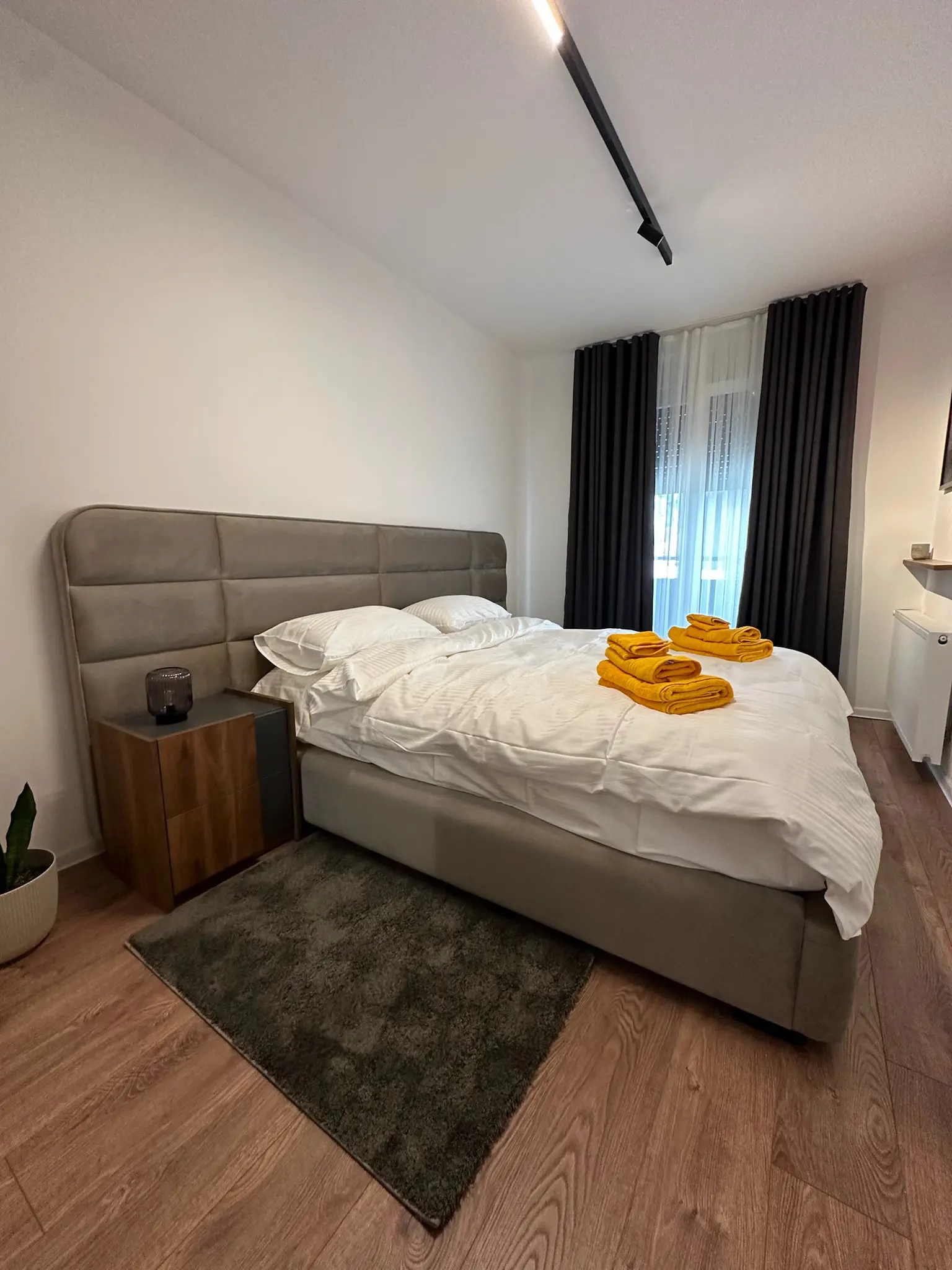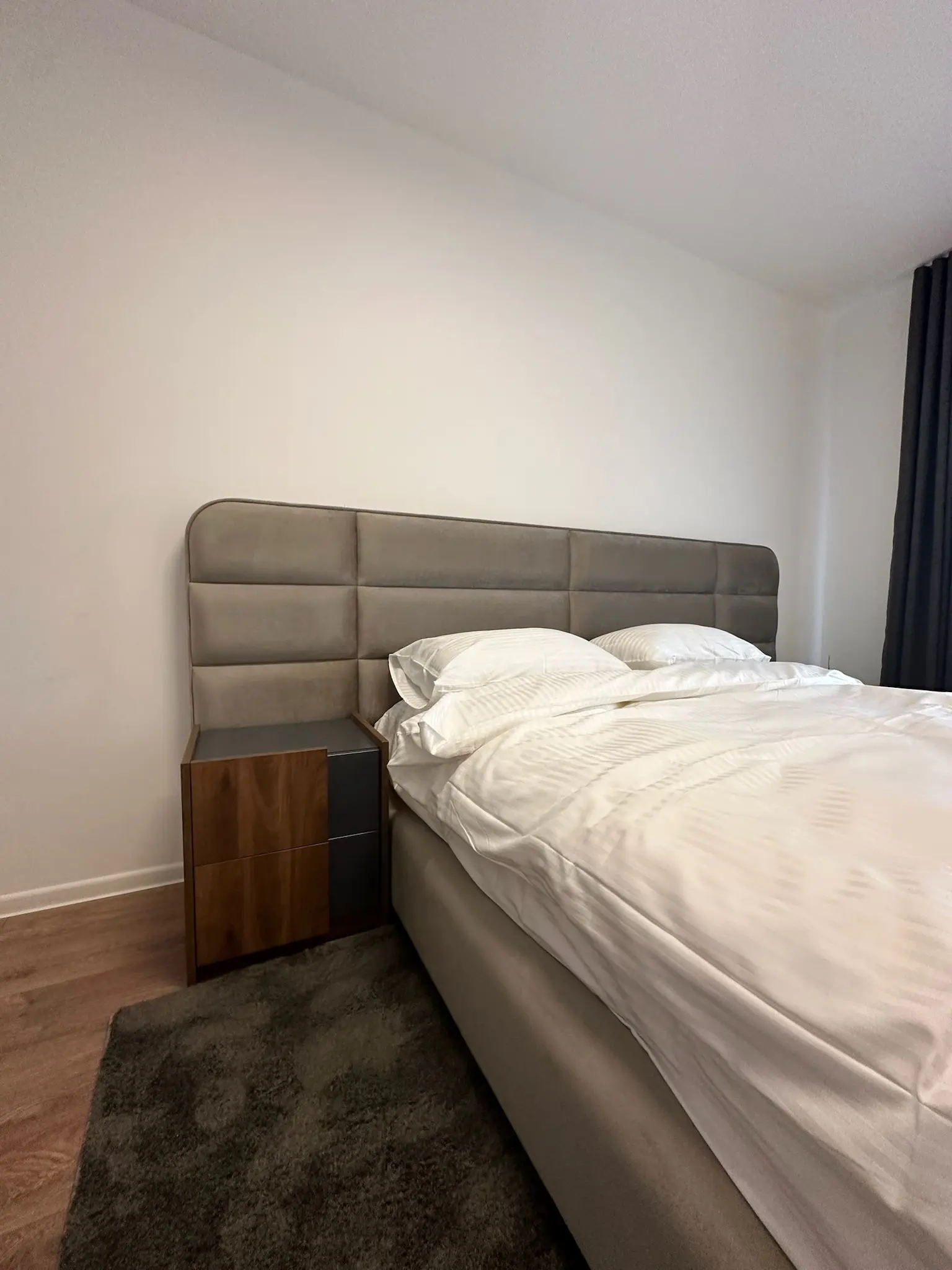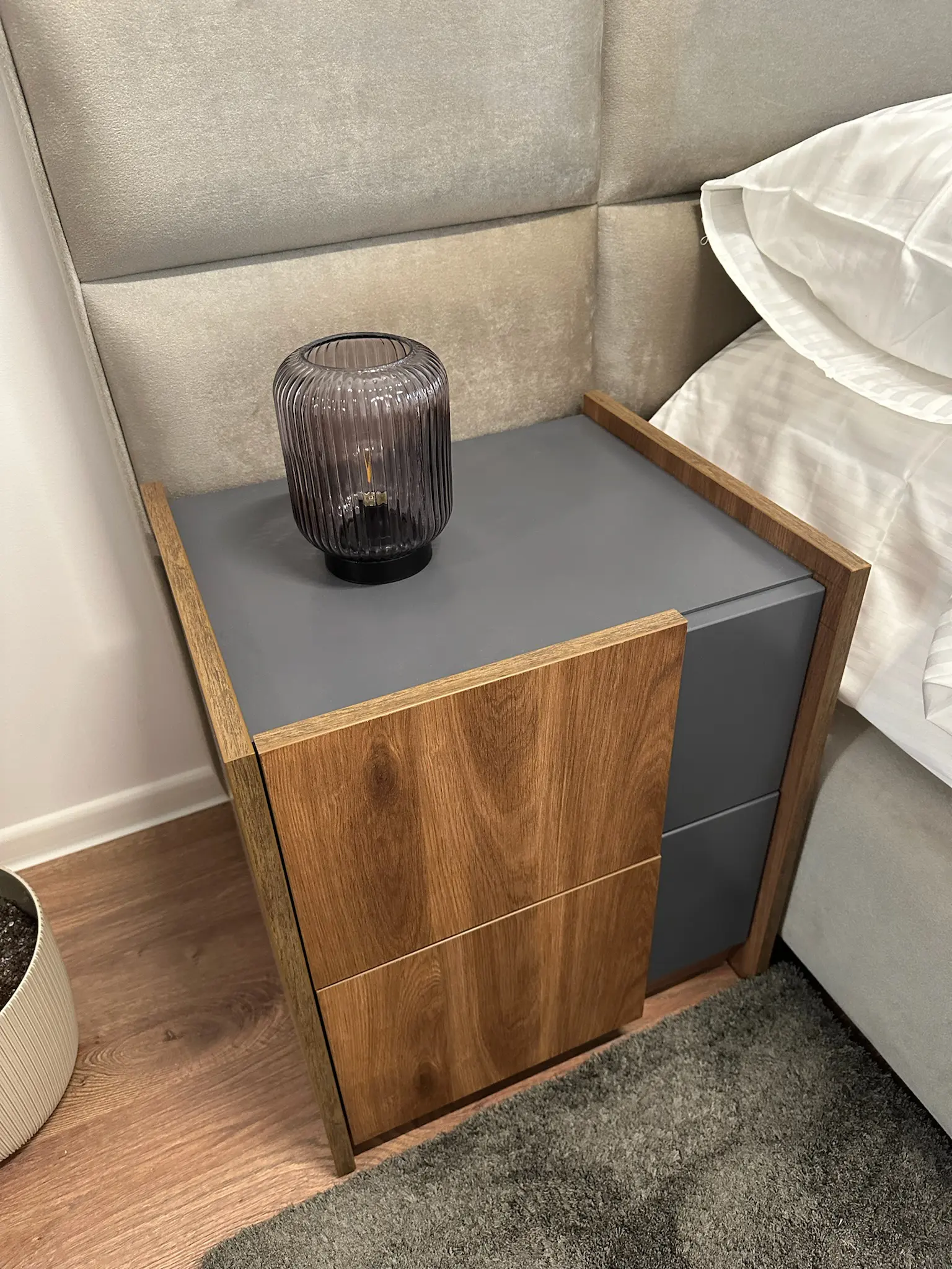 Spavaća soba: tapacirani krevet, bočni ormarići i garderober sa ogledalom