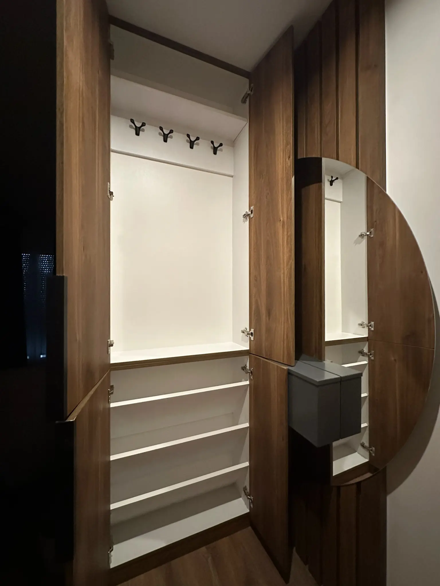 Predsoblje: garderober sa kružnim ogledalom i zatvorenim skladišnim prostorom