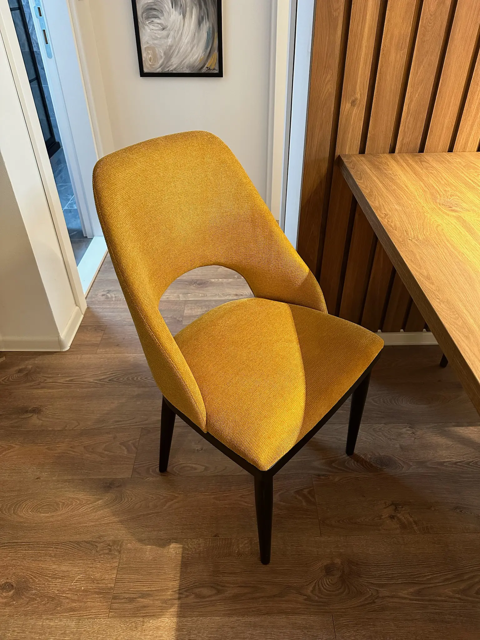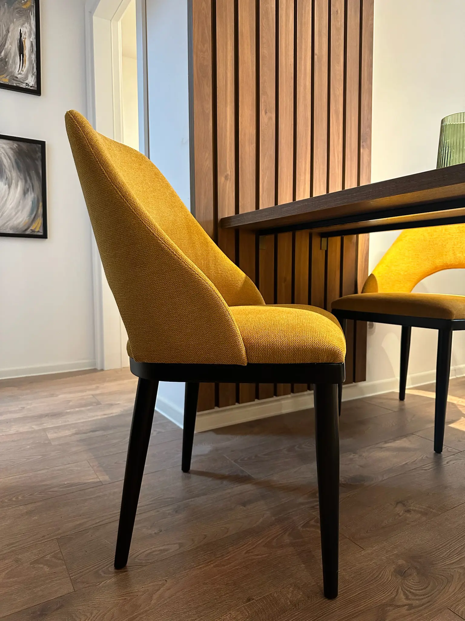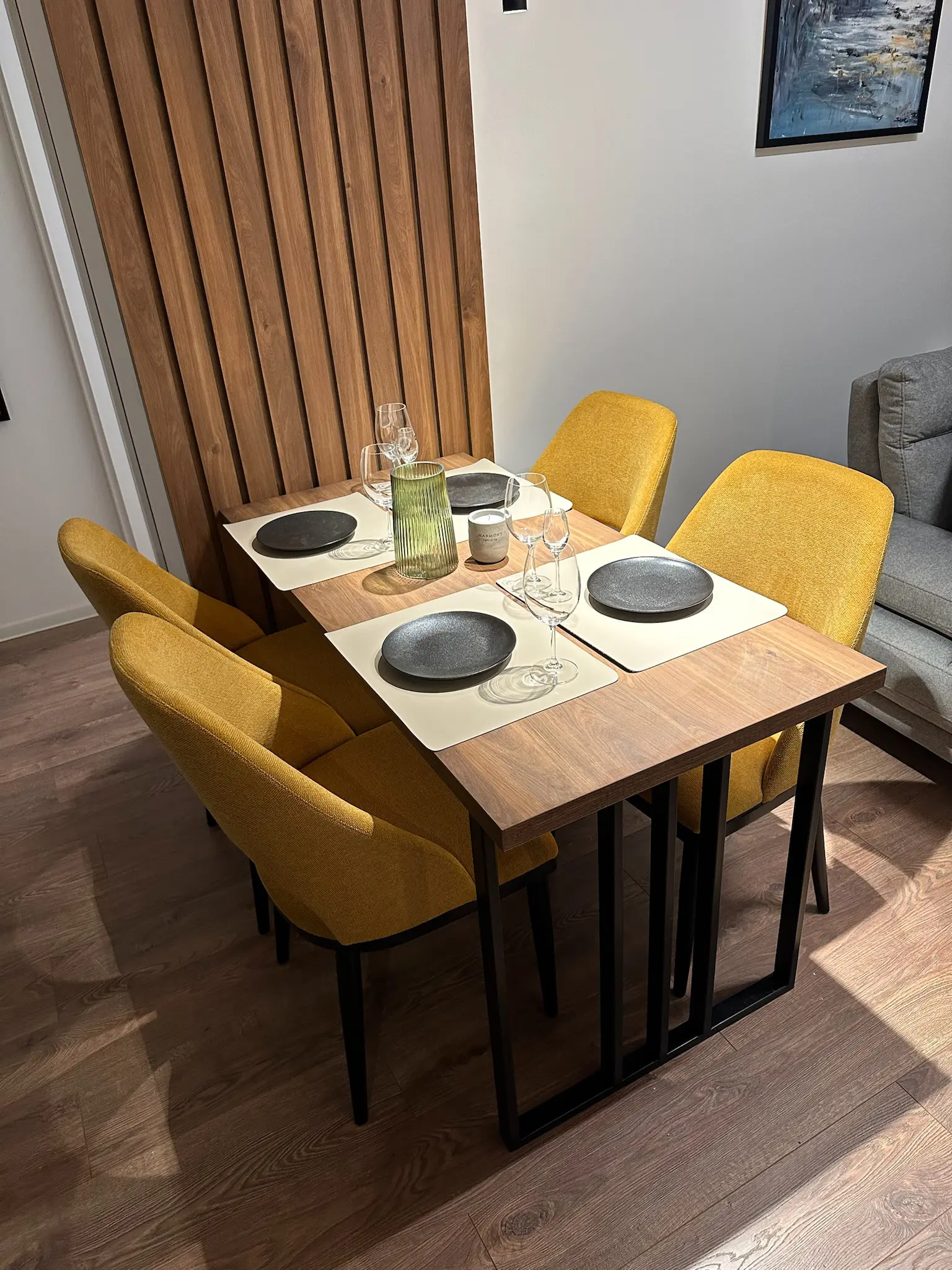 Trpezarija: drveni sto sa metalnim nogarama i udobne narandžaste stolice